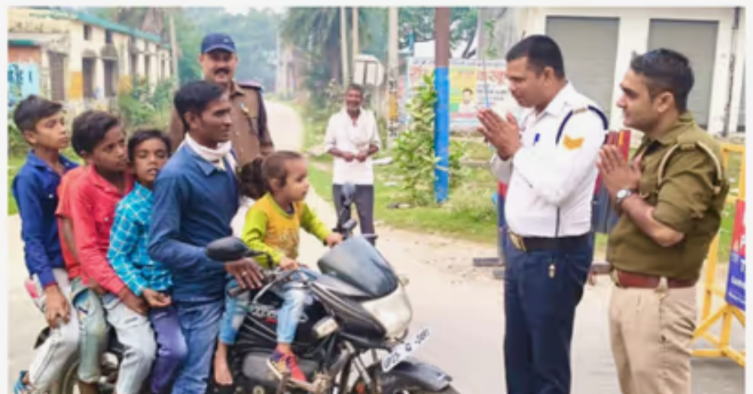 ഉത്തർപ്രദേശിലെ ഹാപൂരിൽ ഹെല്മറ്റ് പോലുമില്ലാതെ കൊച്ച് കുഞ്ഞുങ്ങടക്കം ആറ് കുട്ടികളുമായി ഇരുചക്ര വാഹനത്തിൽ എത്തിയ ആളെ കണ്ട് തൊഴുത് നില്ക്കുന്ന ട്രാഫിക് പോലീസ് ഉദ്യോഗസ്ഥന്റെ ചിത്രം സമൂഹ മാധ്യമങ്ങളില് വൈറലായി. ഭാരത് സമാചാർ എന്ന എക്സ് ഹാന്റിലില് നിന്നാണ് ചിത്രം പങ്കുവയ്ക്കപ്പെട്ടത്.